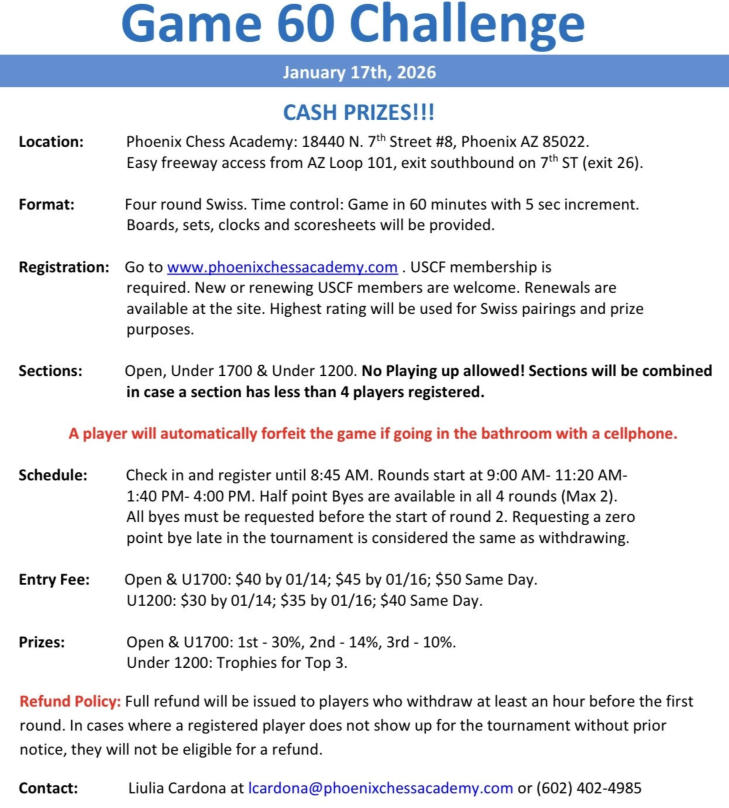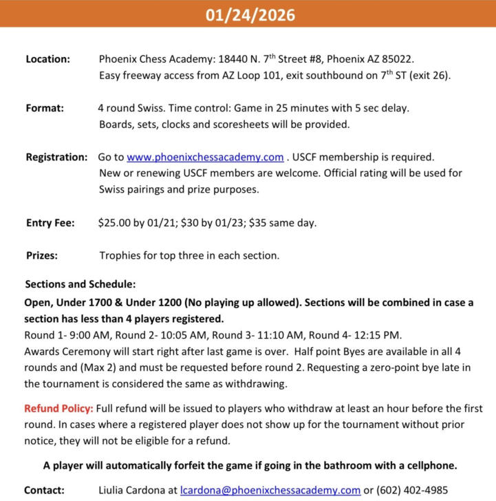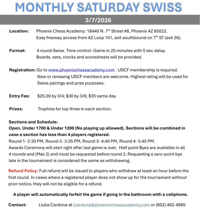 Questions: Email Coach Liulia: lcardona@phoenixchessacademy.com