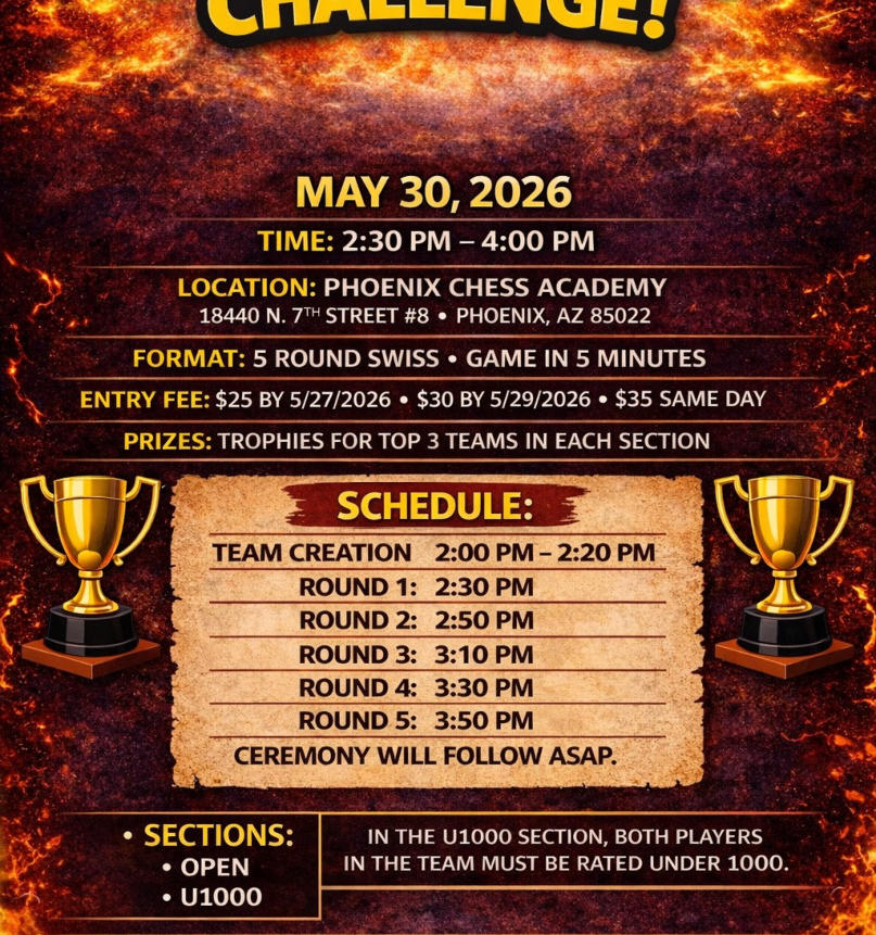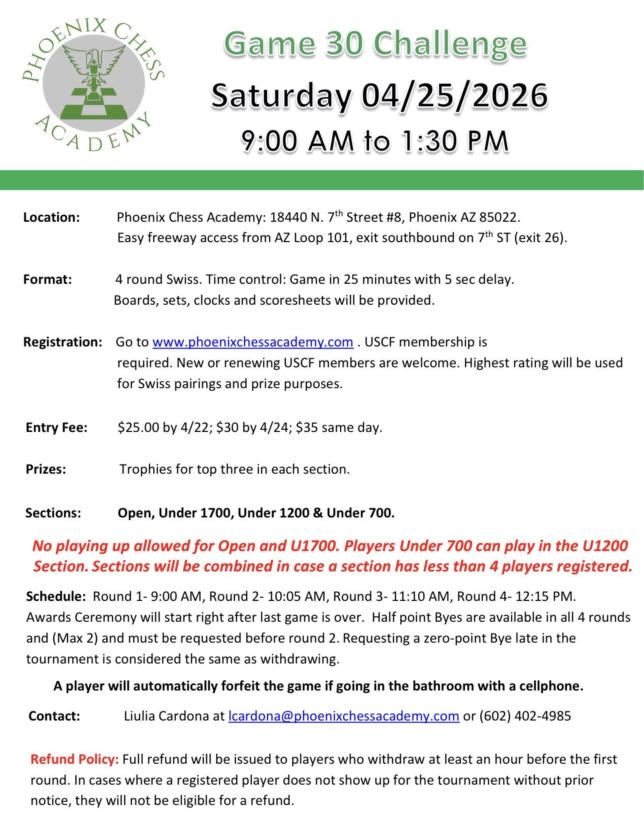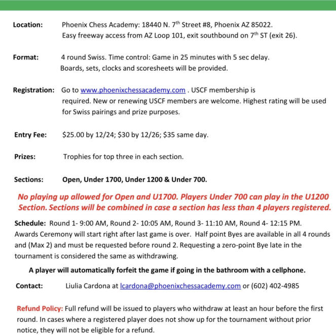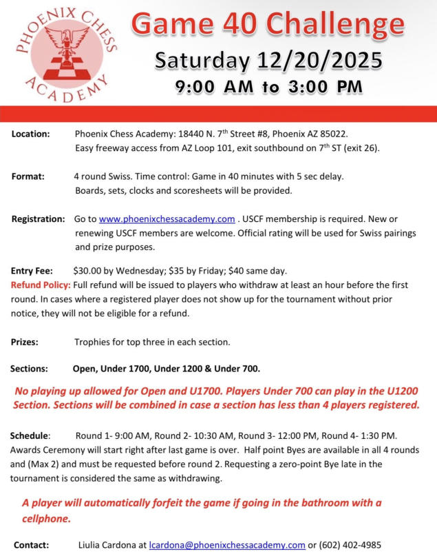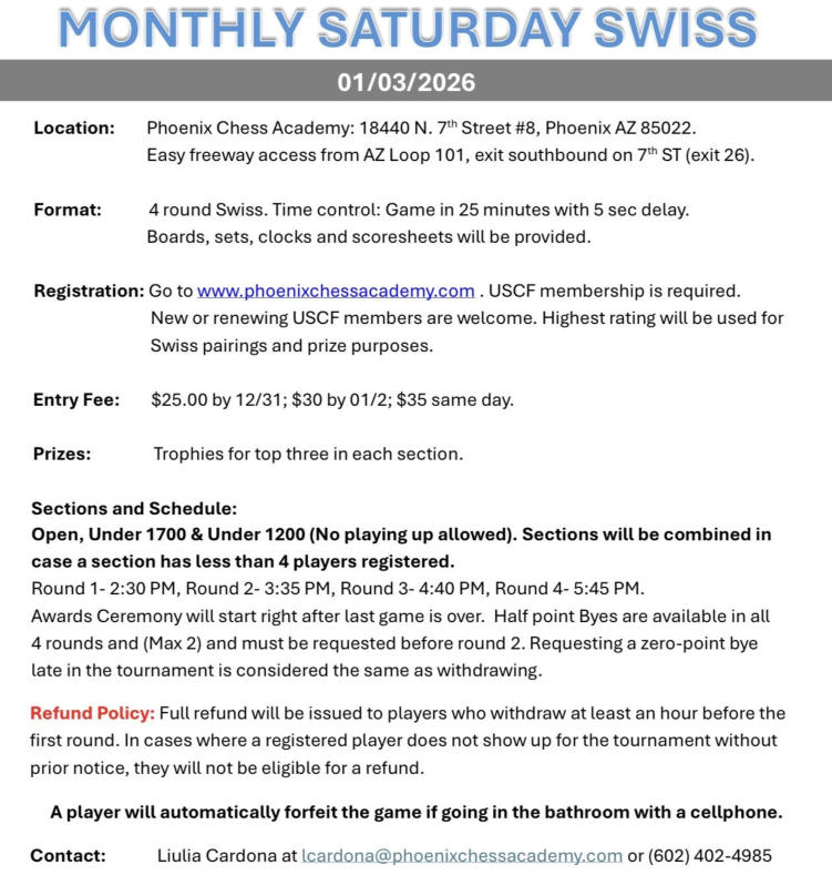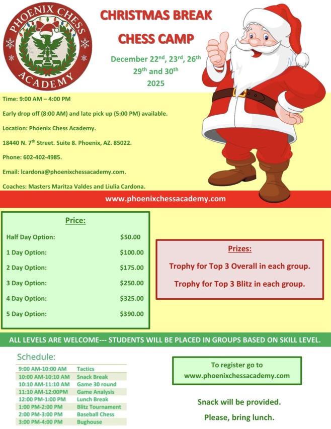 Questions: Email Coach Liulia: lcardona@phoenixchessacademy.com